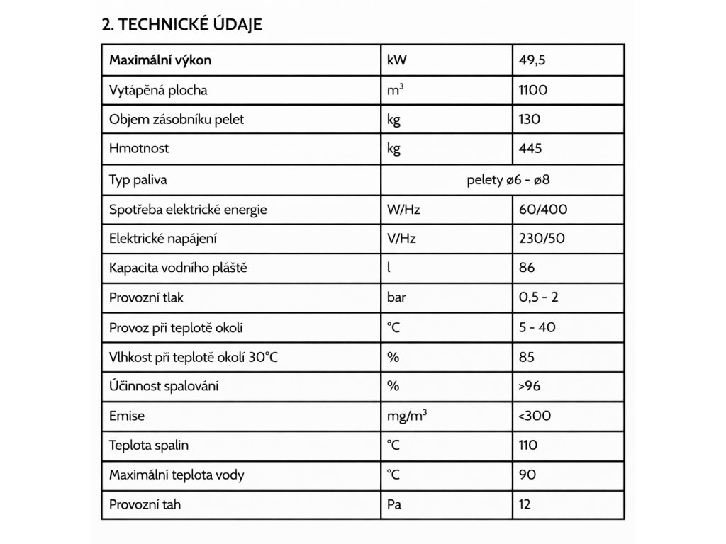 - Orientační spotřeba pelet - 0,7-9,6 kg/h