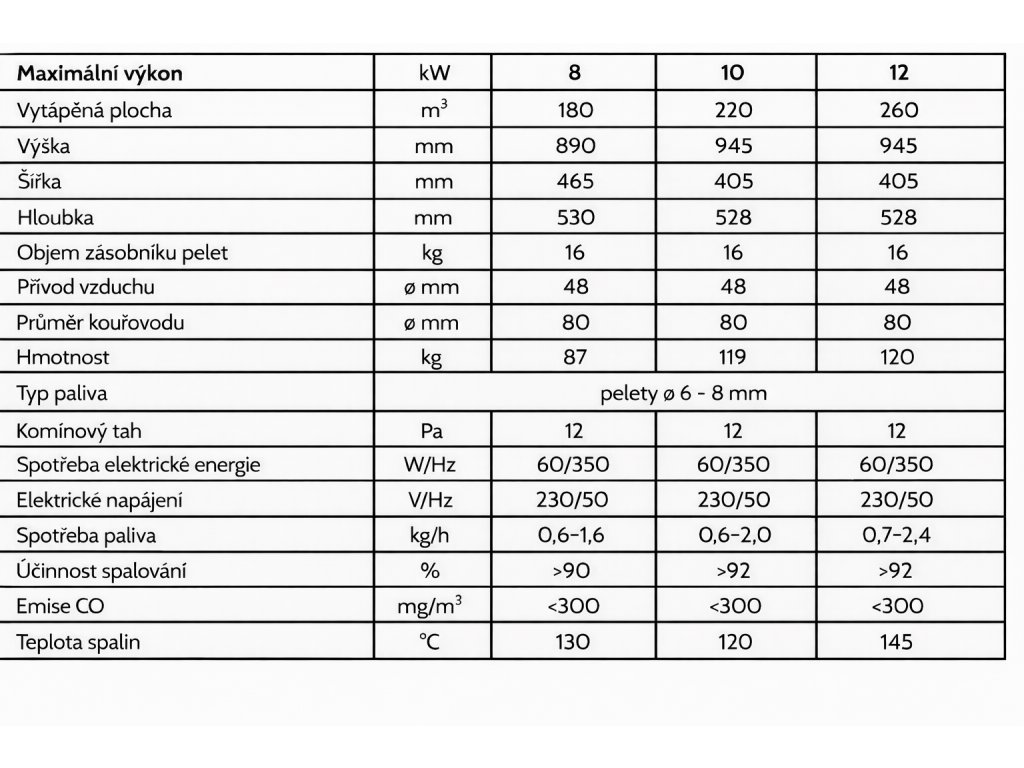 - Orientační spotřeba pelet - 0,6–2,4 kg/h